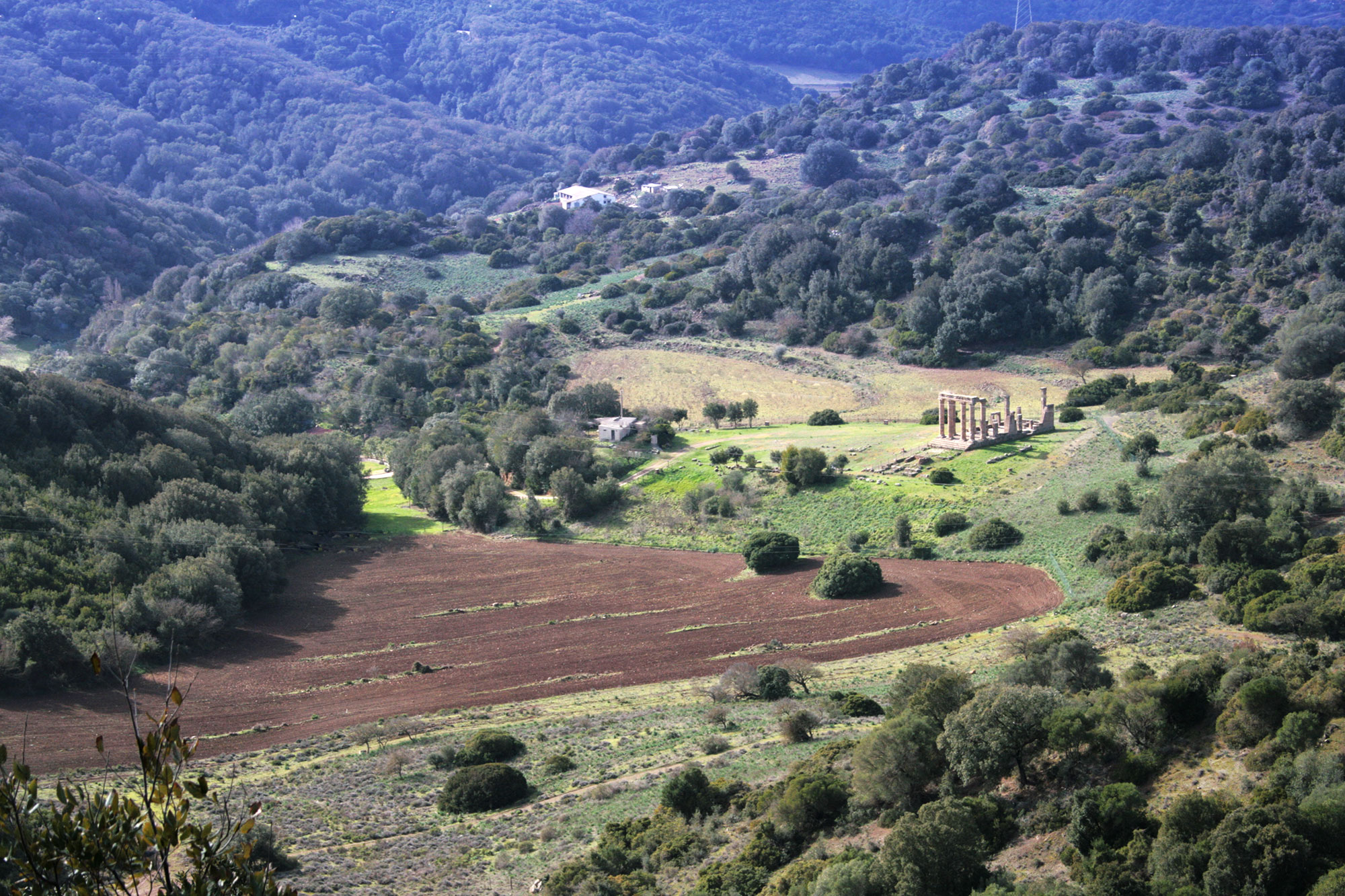 La piana con il Tempio che la chiude su un lato si apprezza una volta che, preso il sentiero che porta alle cave, si sale di qualche decina di metri tanto da avere una visione dall’alto.
